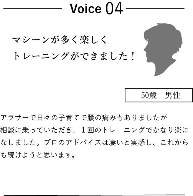 をモットーに初心者の方から、本格的なボディメイキングを目指す上級者まで、幅広いニーズにお応えできる環境を整えています。力を入れている充実したマシン設備は、初心者の方でも扱いやすい基本的なマシンから、上級者の方々が満足できる本格的なフリーウェイトまで、幅広い機器を取り揃えています。これにより、どなたでも自分の目標やレベルに合わせたトレーニングを実現できます。「自分のペースでトレーニングを楽しみたい」という方から「本気で体を追い込みたい」という方まで、全ての会員様が心地よく過ごせる空間づくりを心がけています。